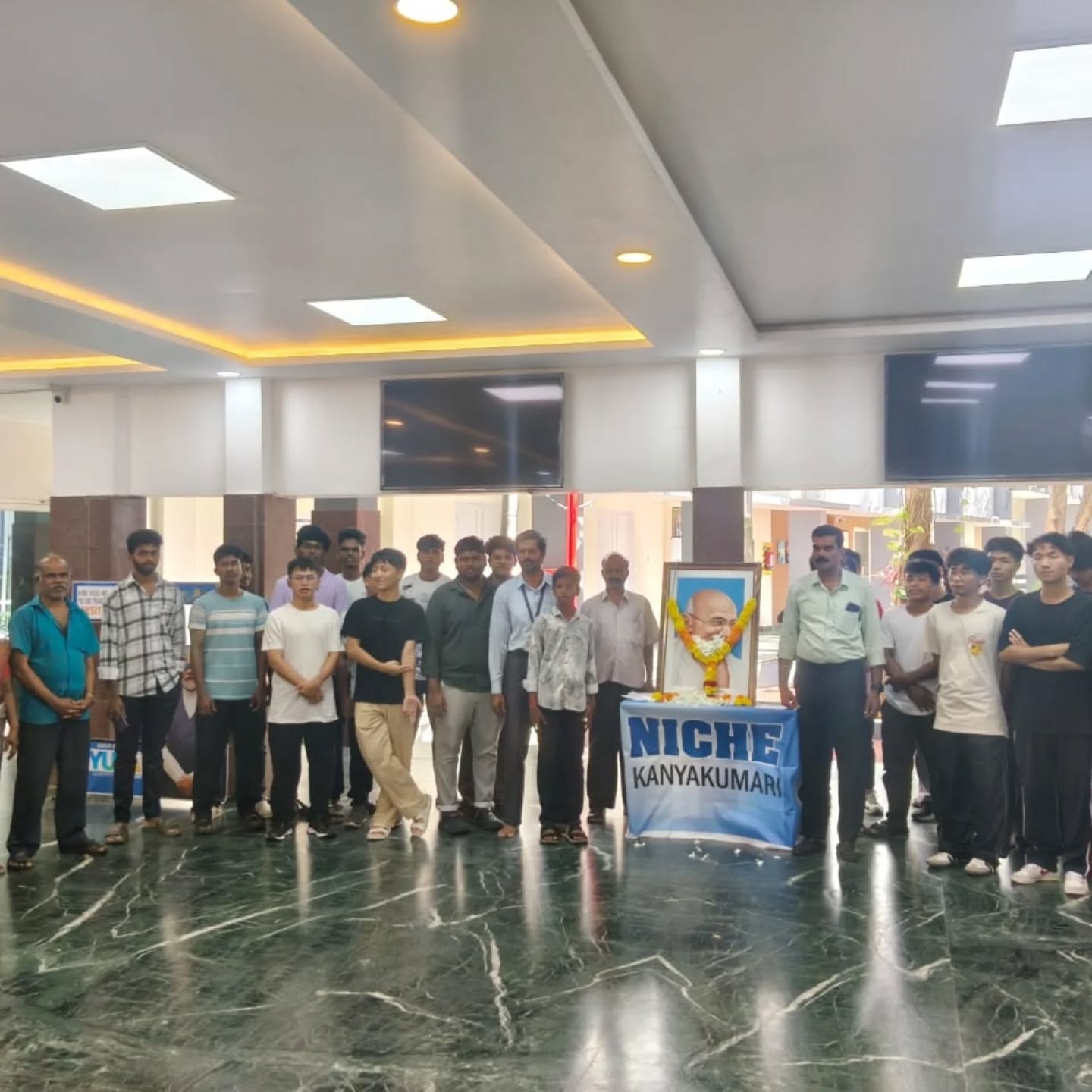 NICHE, Kanyakumari NSS Unit, in collaboration with the Gandhian Peace Forum, celebrated Gandhi Jayanthi by offering Pushpanjali and conducting a campus cleaning drive. The campaign was led by NSS Coordinator Dr. Unnikrishnan and Hostel AO Capt. S. Sajeev. Students and staff actively participated and contributed to the program.