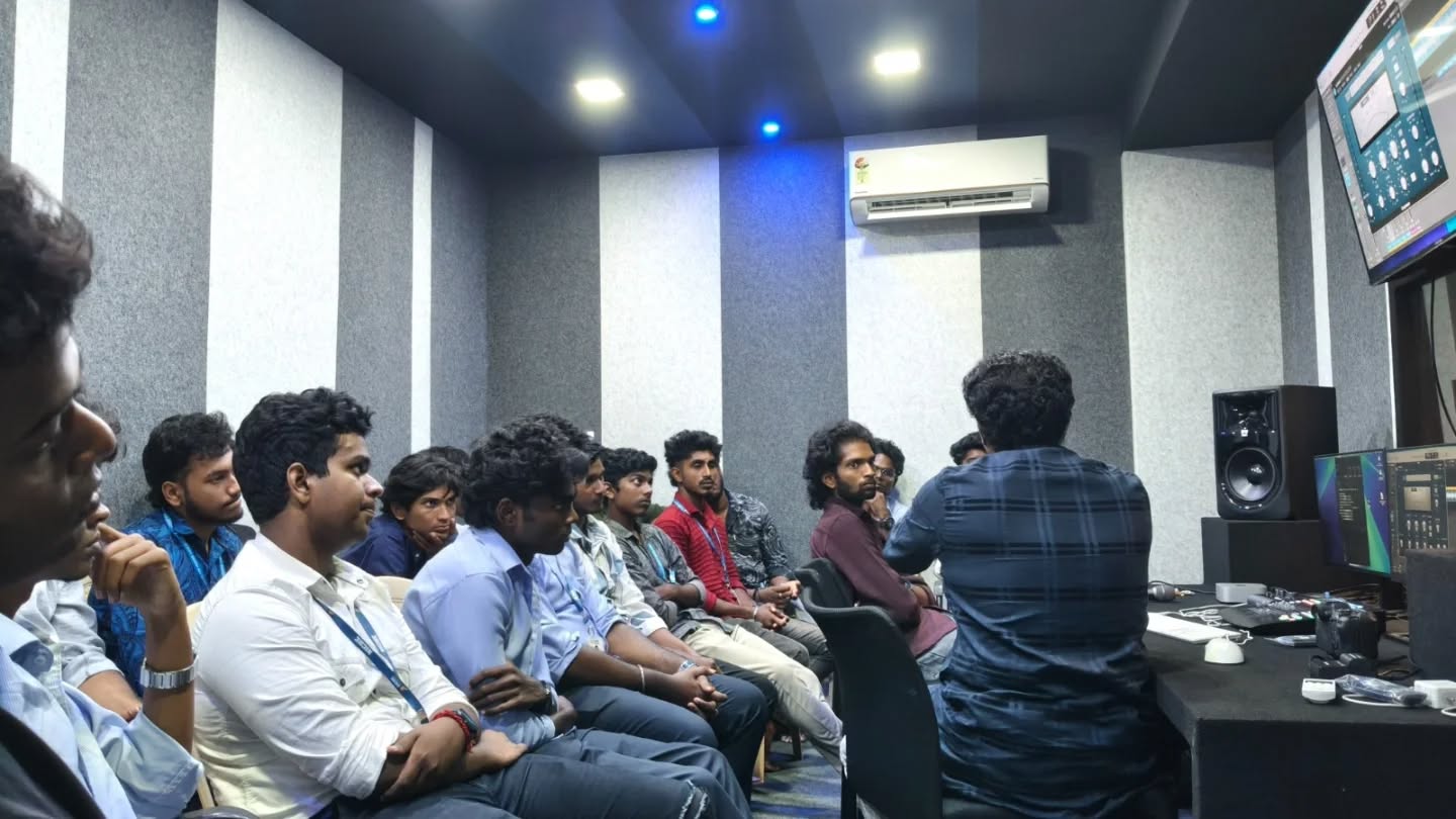 Renowned Music Composer and Recordist Mr. Biju Ram led the session, providing practical training on professional recording setups — including microphones, audio interfaces, mixers, and studio monitors.
